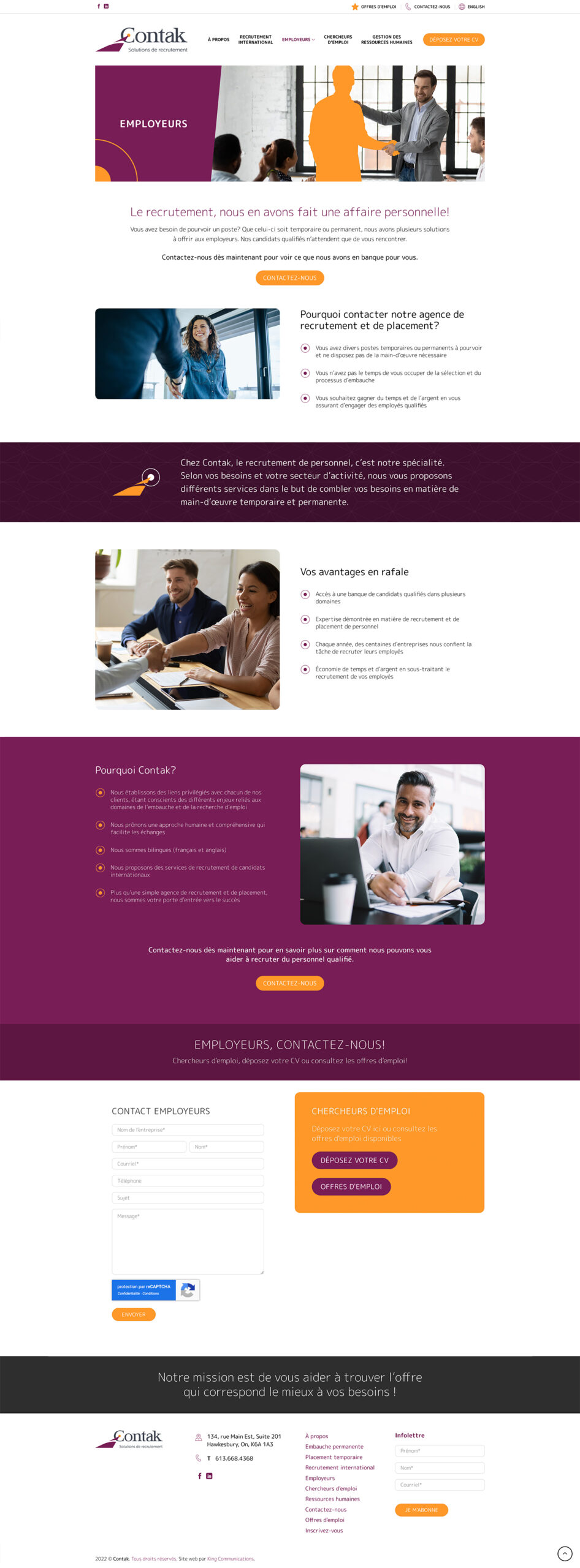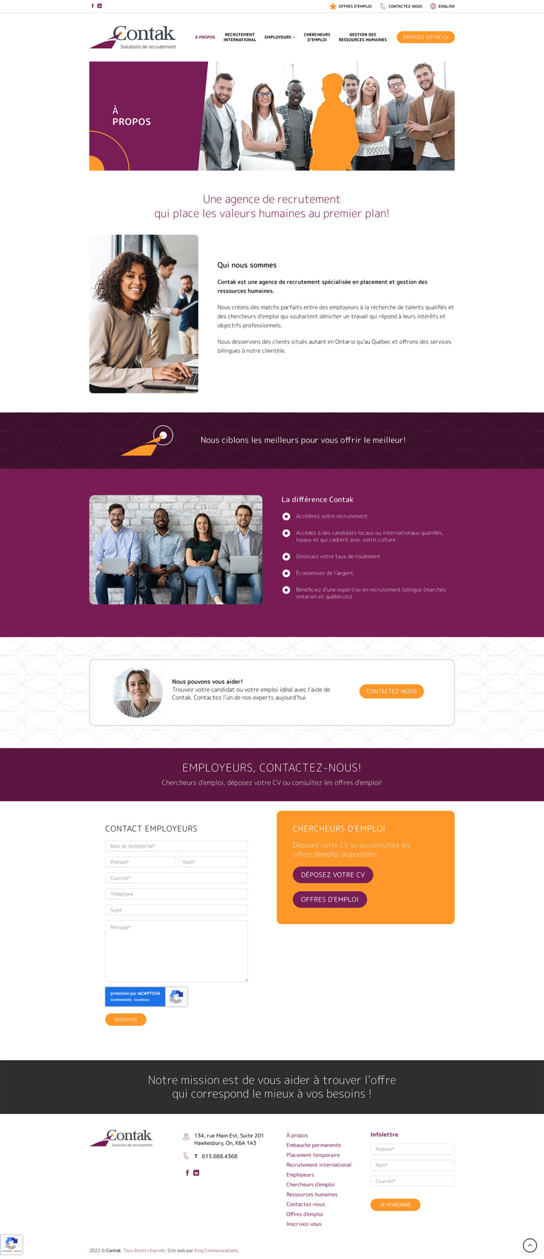 Contak est une entreprise située à Hawkesbury en Ontario, tout près de la frontière du Québec. Elle se spécialise dans le secteur des ressources humaines et dessert une clientèle d’affaires/employeurs dans la grande région de Montréal et d’Ottawa, en offrant des services de recrutement de personnel et de soutien administratif au niveau des ressources humaines. Elle possède un champ d’expertise complet pour être en mesure de venir en aide à la majorité des secteurs d’activités et le recrutement de main-d’œuvre à l’international vient de s’ajouter aux services offerts à sa clientèle.
