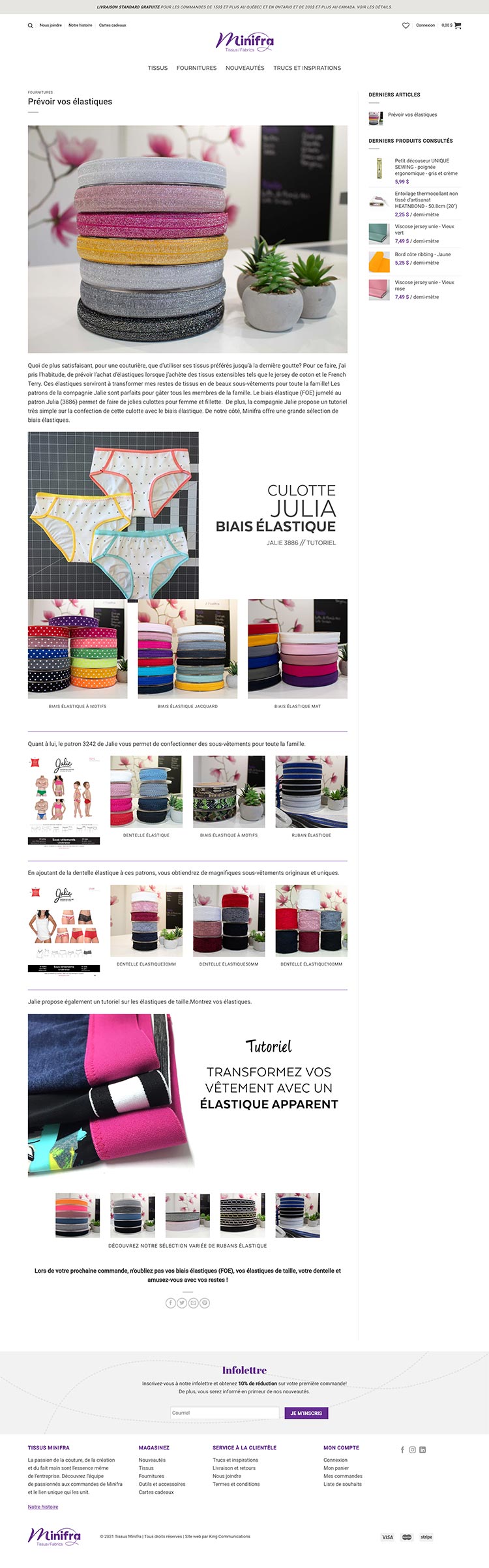 Minifra est une toute nouvelle entreprise familiale qui propose une grande variété de tissus et d’accessoires pour la couture. Destinée autant aux couturières de loisir qu’aux créatrices et petites entreprises manufacturières, l’offre de Minifra se démarque par l’excellent rapport qualité-prix. Contrairement à plusieurs concurrents, tous les produits de Minifra sont en inventaire et les tissus offerts sont testés pour en assurer la qualité. De plus, certains tissus disponibles sont des conceptions uniques créées par des artistes locaux et sont fabriqués au Québec, le tout dans un but de favoriser l’achat local.